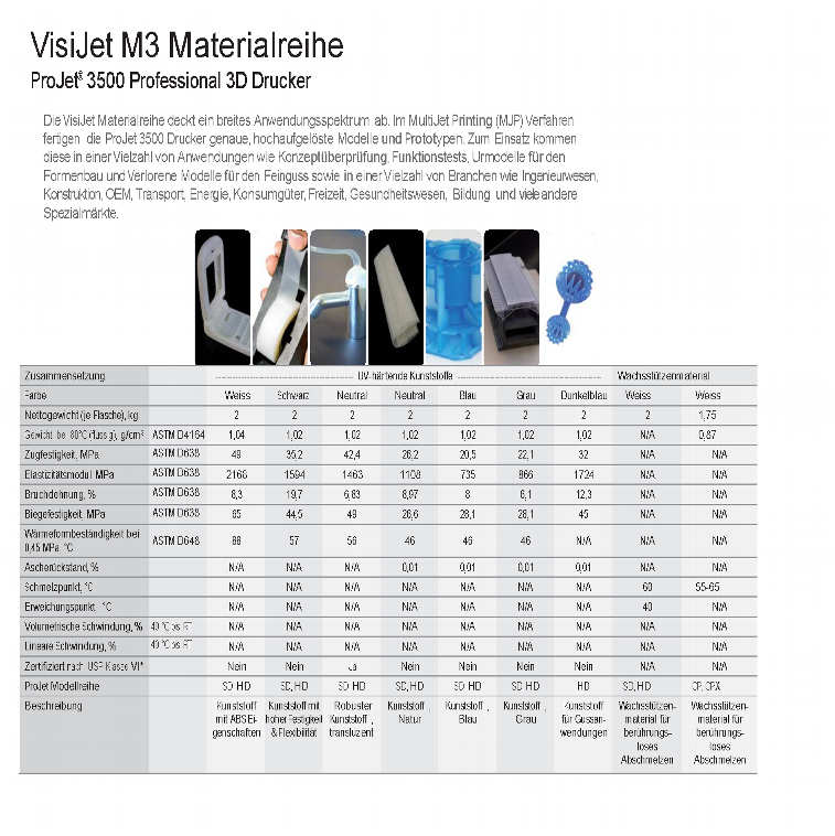 Die Materialreihe deckt ein breites Anwendungsspektrum ab. Im MultiJetPrinting (MJP) Verfahren fertigen die 3D-Drucker genaue, hochaufgelöste Modelle und Prototypen.